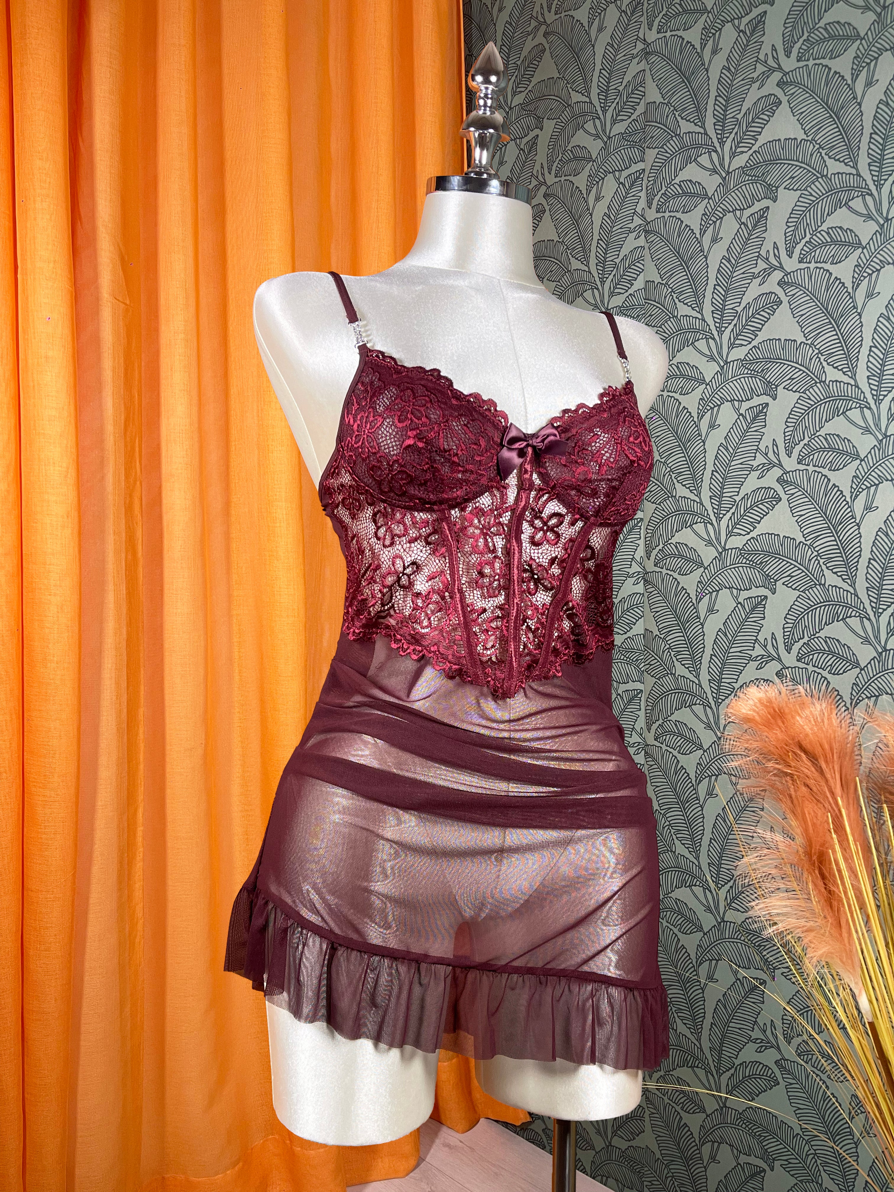 La nuisette à coupe légèrement cintrée épouse la silhouette avec douceur sans serrer, tandis que la robe de chambre en dentelle florale apporte une touche raffinée et décorative. Les détails floraux en relief ajoutent du charme à l’ensemble, tout en conservant un style équilibré et confortable.