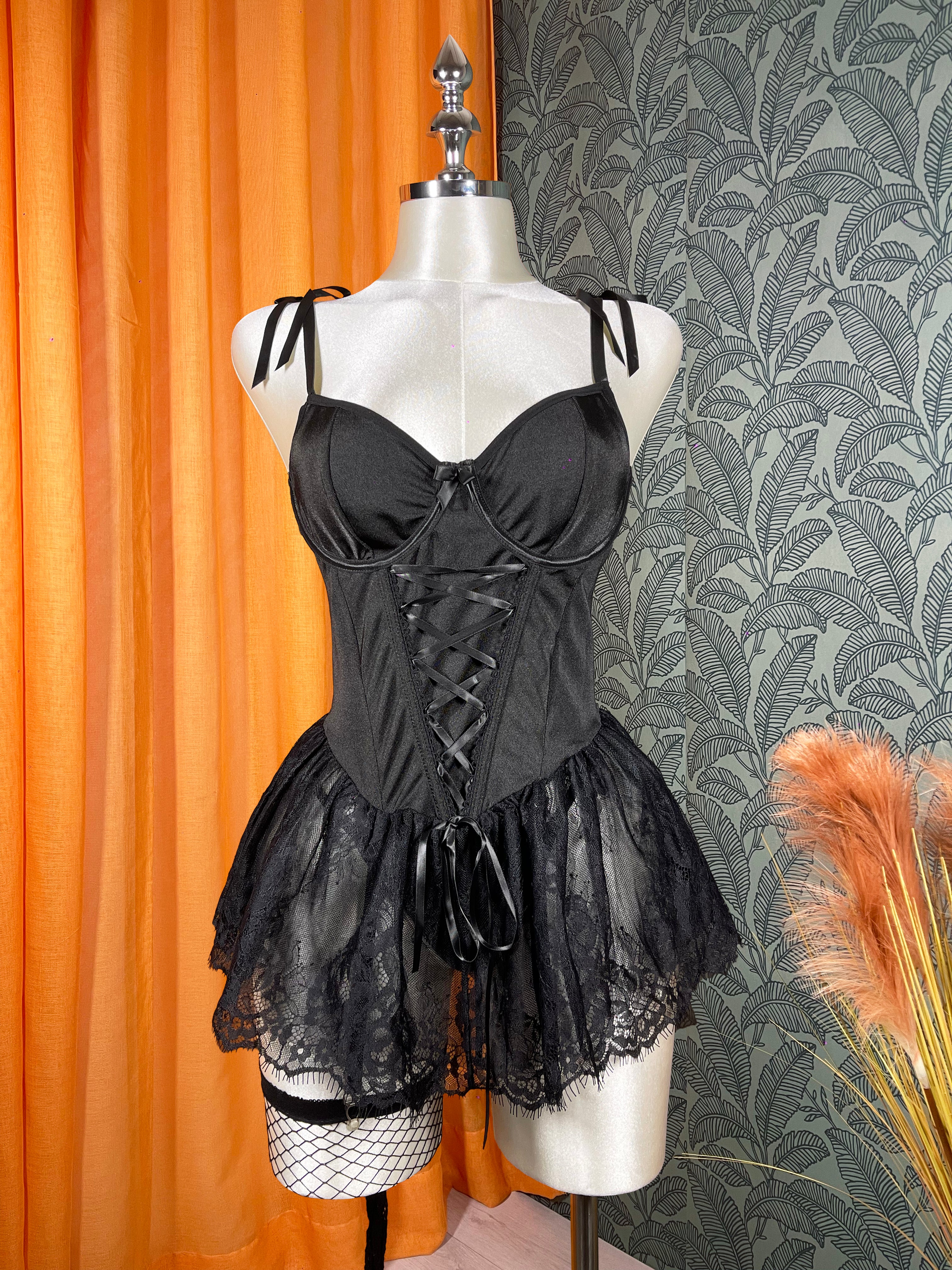 Cette robe noire pour femme associe une coupe corsetée à une jupe légère en dentelle, pour un style raffiné et harmonieux.
